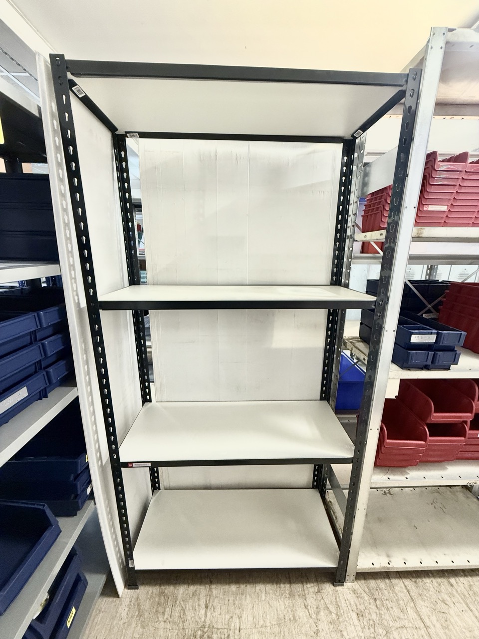 Plauktu sistēma Versa sastāv no metāla balstiem, metāla plauktu pārlikām un laminētas skaidu plātnes plauktiem.